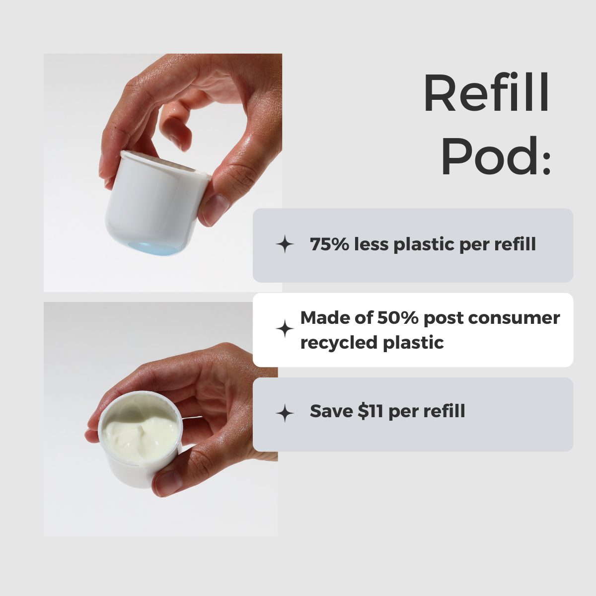 Refill Instructions: When your jar is empty, simply twist off the cap, insert a new refill pod into the jar, and replace the cap. Each pod lasts approximately 6-8 weeks with daily use.